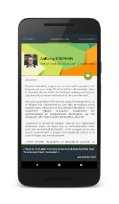 This application shows you my whole Curriculum Vitae within an original format, and with a lot of information about me.