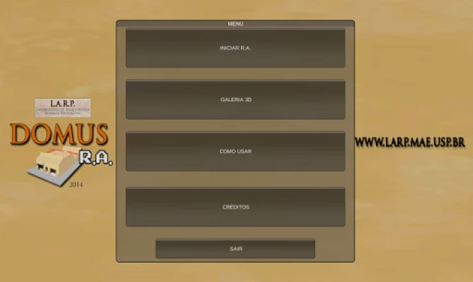 IMPORTANTE: O aplicativo somente funcionará quando a câmera do dispositivo estiver apontada para o marcador que pode ser baixado nesse endereço:http://www.larp.mae.usp.br/PlantaDomusRA.pdf